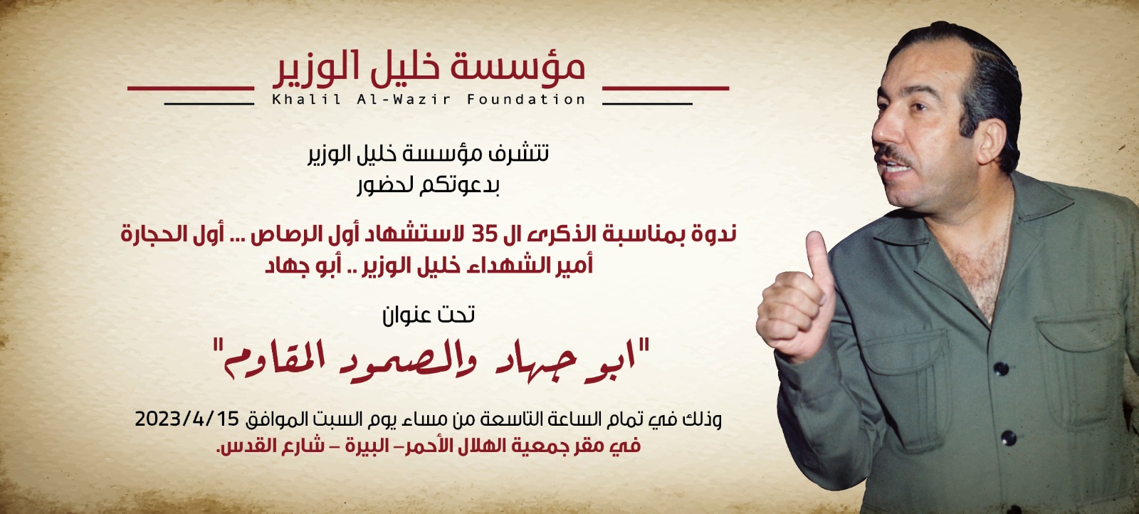 أحيت مؤسسة خليل الوزير، مساء اليوم السبت، الذكرى الخامسة والثلاثين لاستشهاده، خلال ندوة عقدتها بمقر جمعية الهلال الأحمر بمدينة البيرة، بعنوان "أبو جهاد والصمود المقاوم".